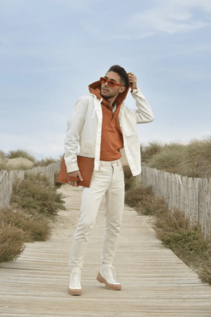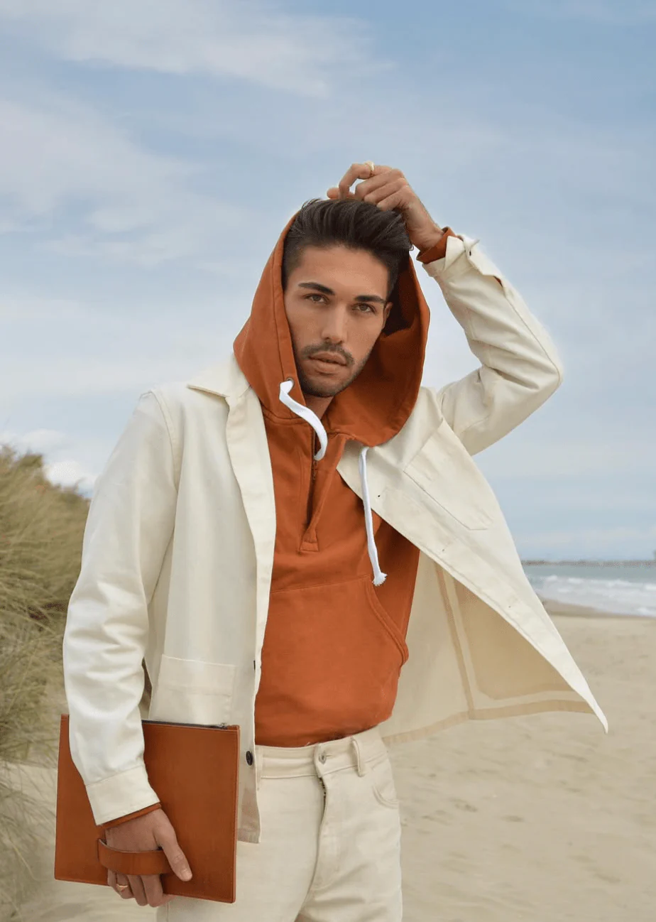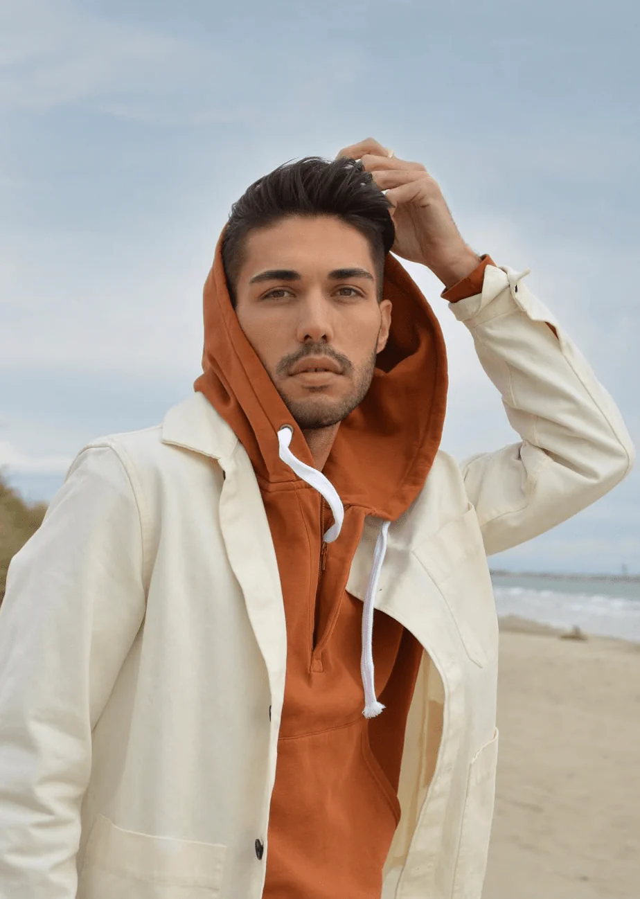 Hoodie homme, conçu à partir de coton biologique. Incarne l’éco-responsabilité, avec son col zippé qui allie confort optimal et style décontracté. Antoine, 1m87 porte le hoodie en M.