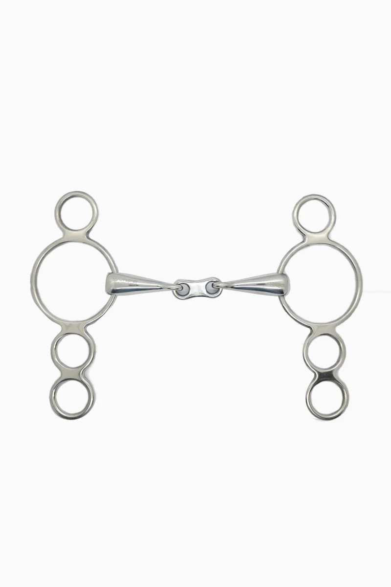 Matières :– Acier inoxydable– Canons de 18 mm avec double brisure à lien plat Spécificités techniques :– Mors à action combinée offrant un effet abaisseur sur l’encolure– Contact doux et direct– Rênes fixées à l’anneau inférieur : apportent plus de stabilité– Rênes avec alliances aux anneaux du milieu et du bas : offrent une variabilité […]