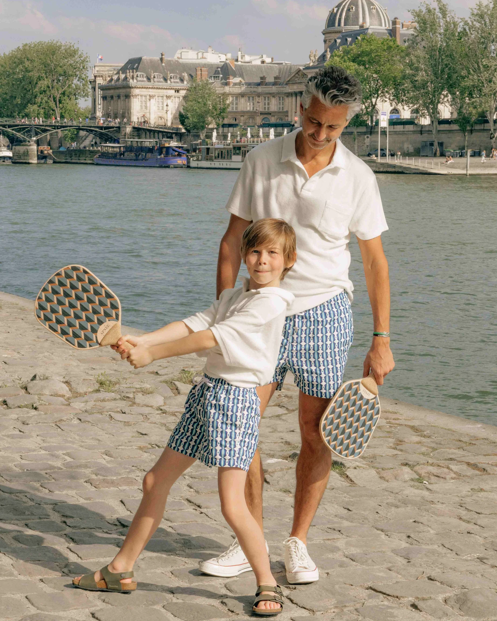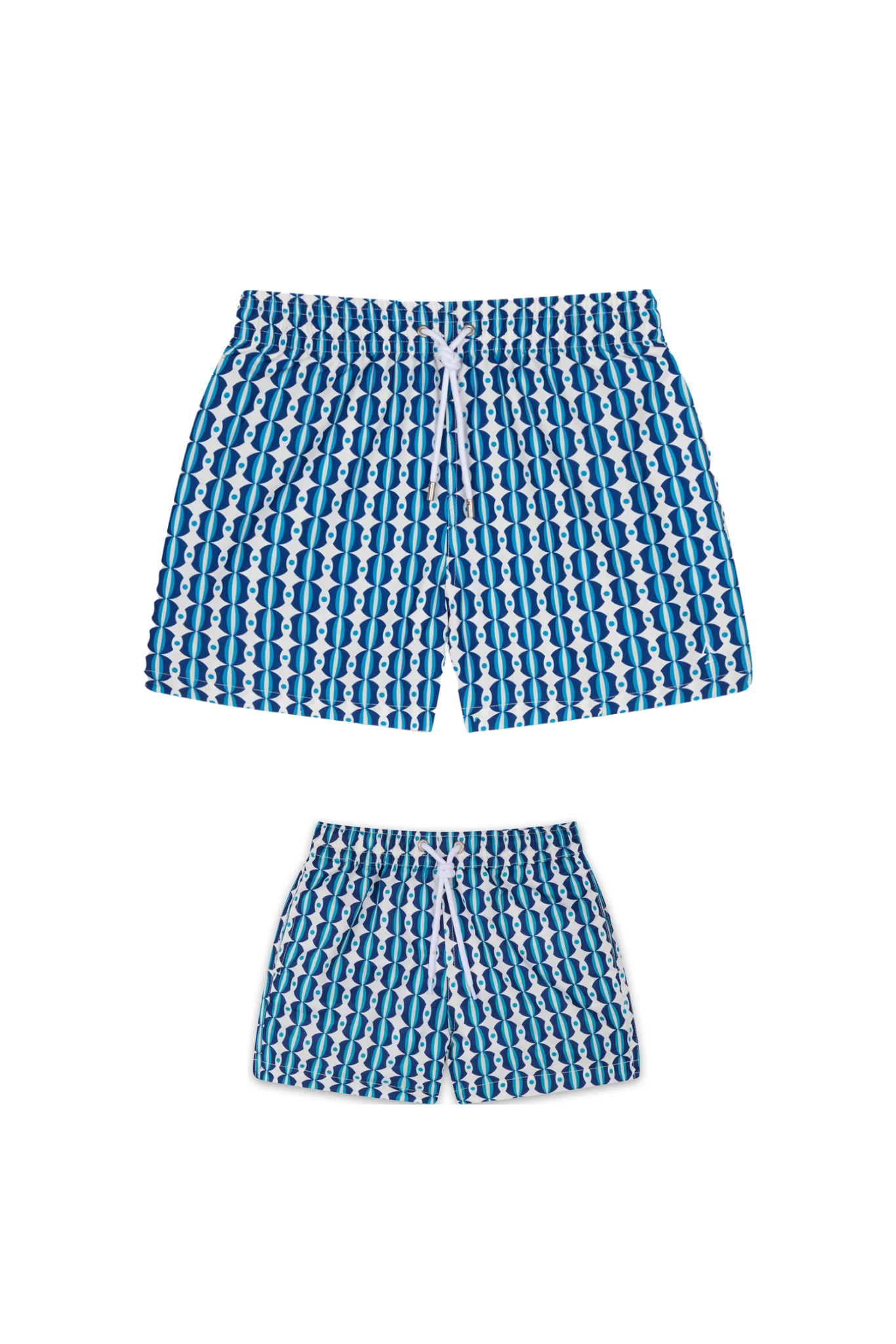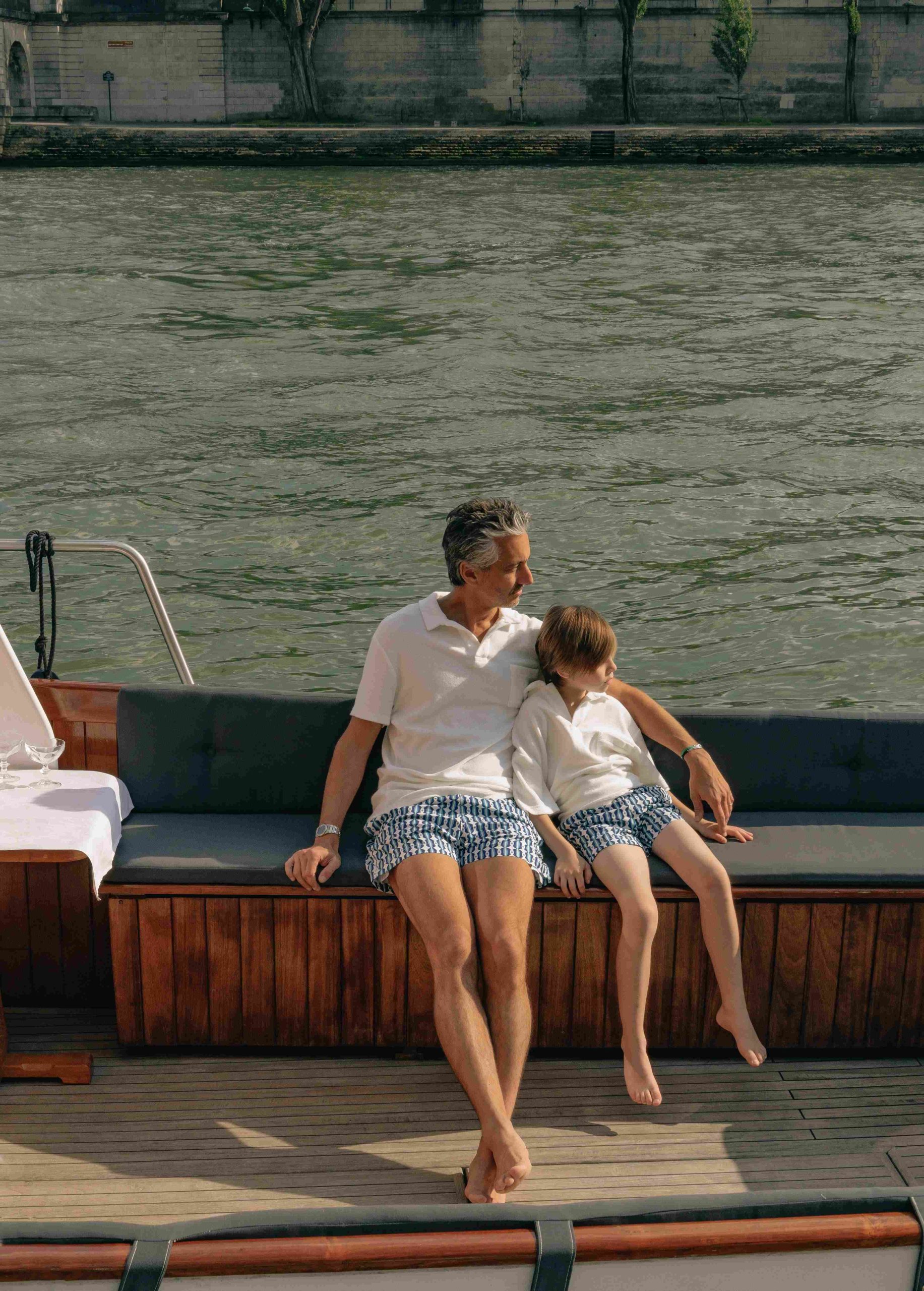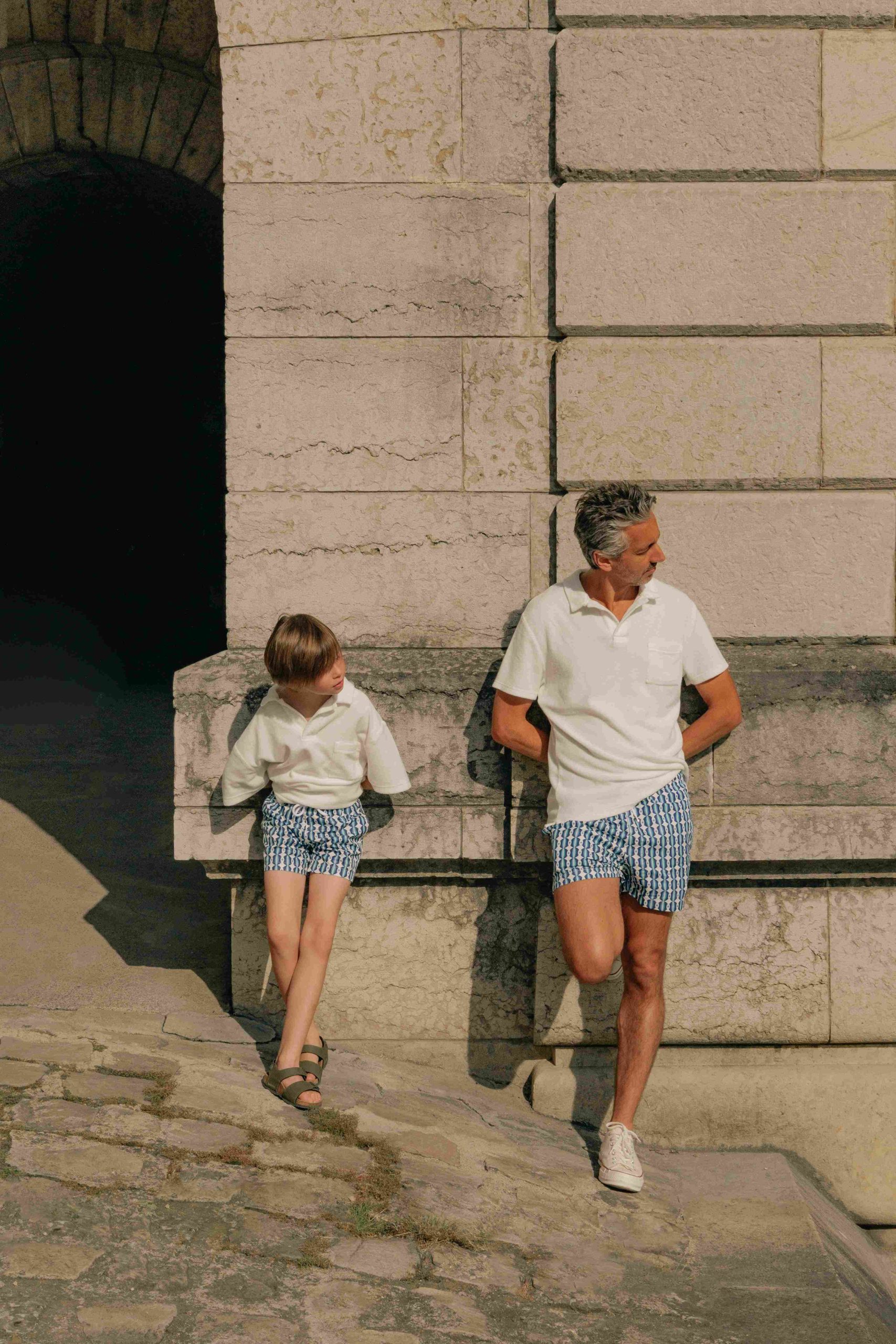 Un duo de maillots assortis papa enfant. Notre short de bain imprimé Salento bleu se décline sur un modèle garçon de 4 à 10 ans.