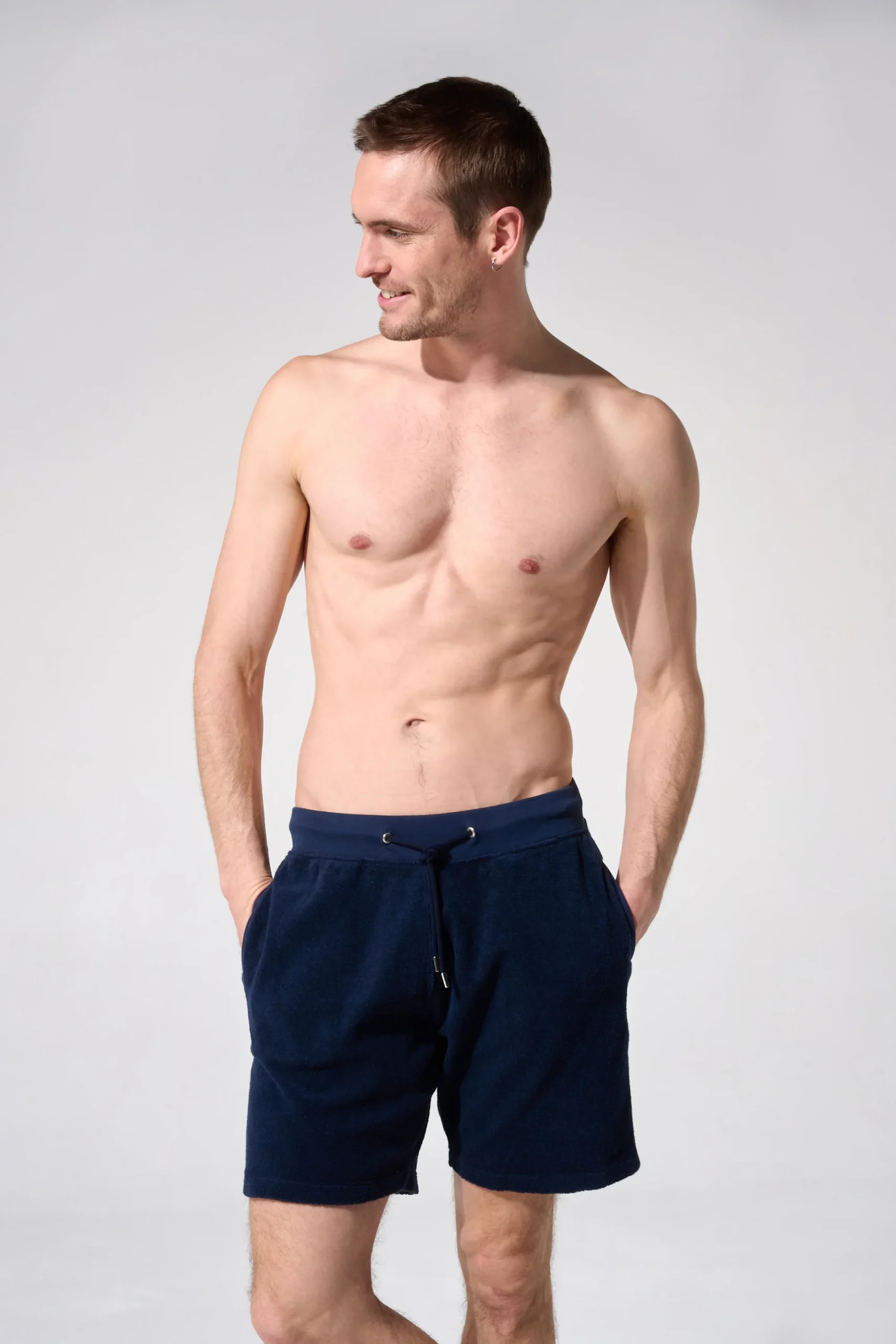 Short en coton éponge homme bleu marine, conçu à partir de coton éponge de qualité. Léger et agréable à porter de manière décontractée. Maxime (torse nu) mesure lui 1m87 et porte du M. Taille normalement.