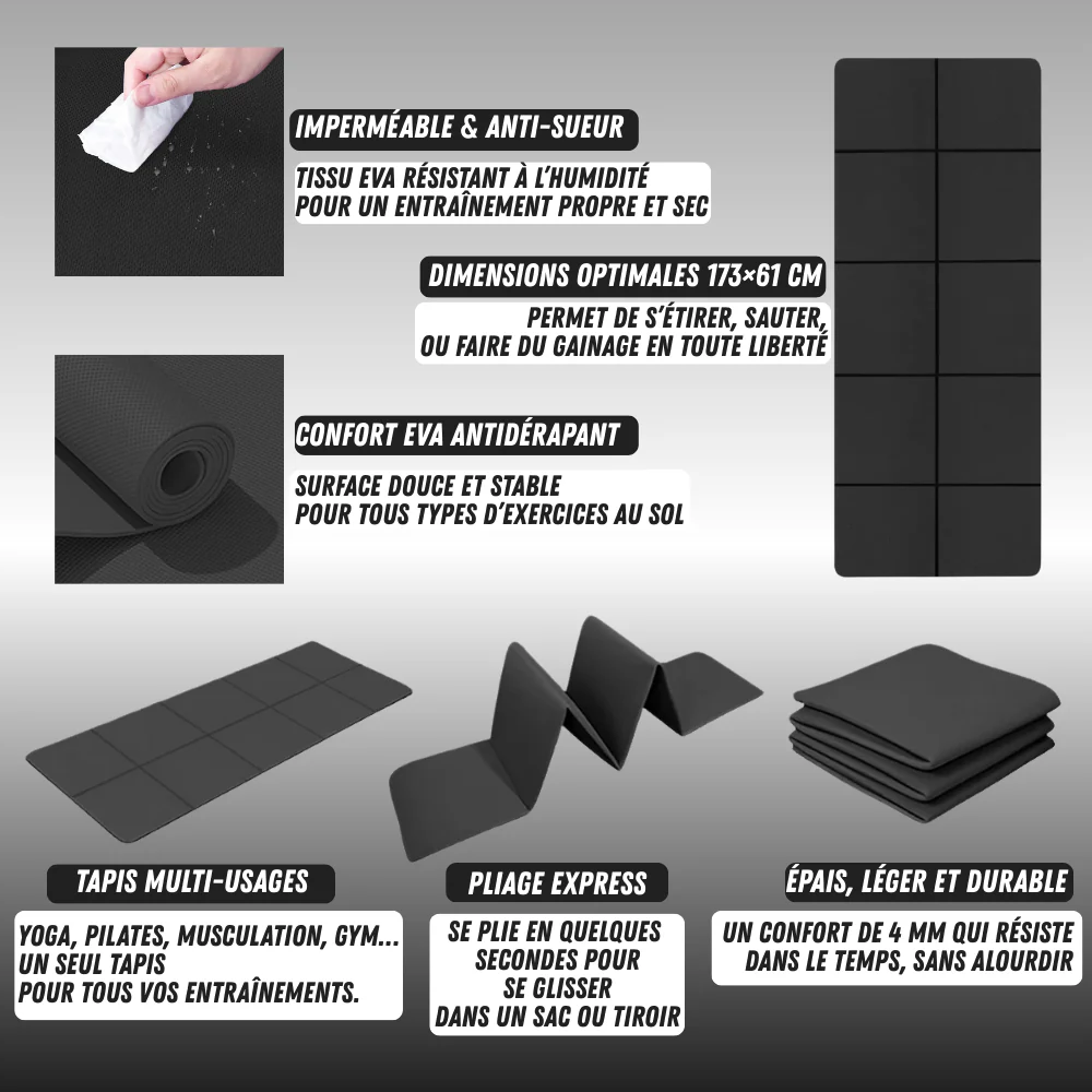 - Usages : yoga, pilates, musculation, exercices au sol