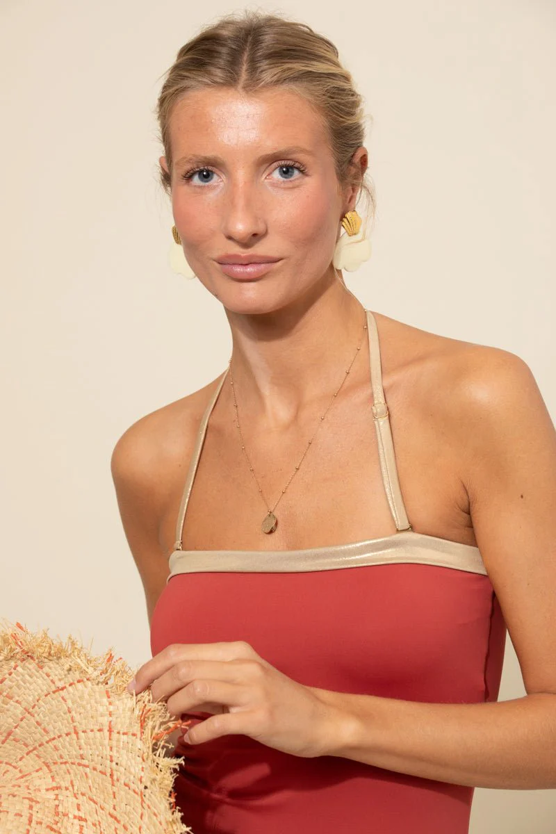 Marbella est un maillot de bain une pièce anti-UV de forme bustier idéal pour les adeptes de cette coupe élégante. Sa bretelle réglable autour du cou permet de nager en toute décontraction. Elle est aussi amovible pour permettre à ce joli maillot bustier d’être porté comme un body sous une chemise, avec un short, une jupe… Le dos est droit et monte haut pour allonger la silhouette. Coques amovibles, doublé devant. Ce maillot de bain est conseillé pour les poitrines en A,B ou C. Ici en Riad, un terracotta lumineux rehaussé d’une touche de doré (décolleté et bretelle). On adore!