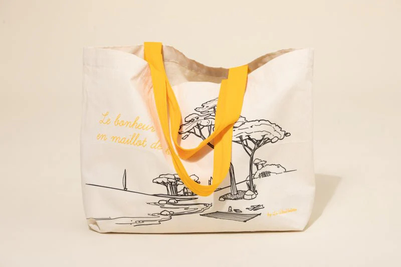 Anses de couleur jaune et dessin exclusif dessiné au bureau qui représente une jolie plage de sable du bassin d’Arcachon et des pins qui sentent bon la chlorophylle….