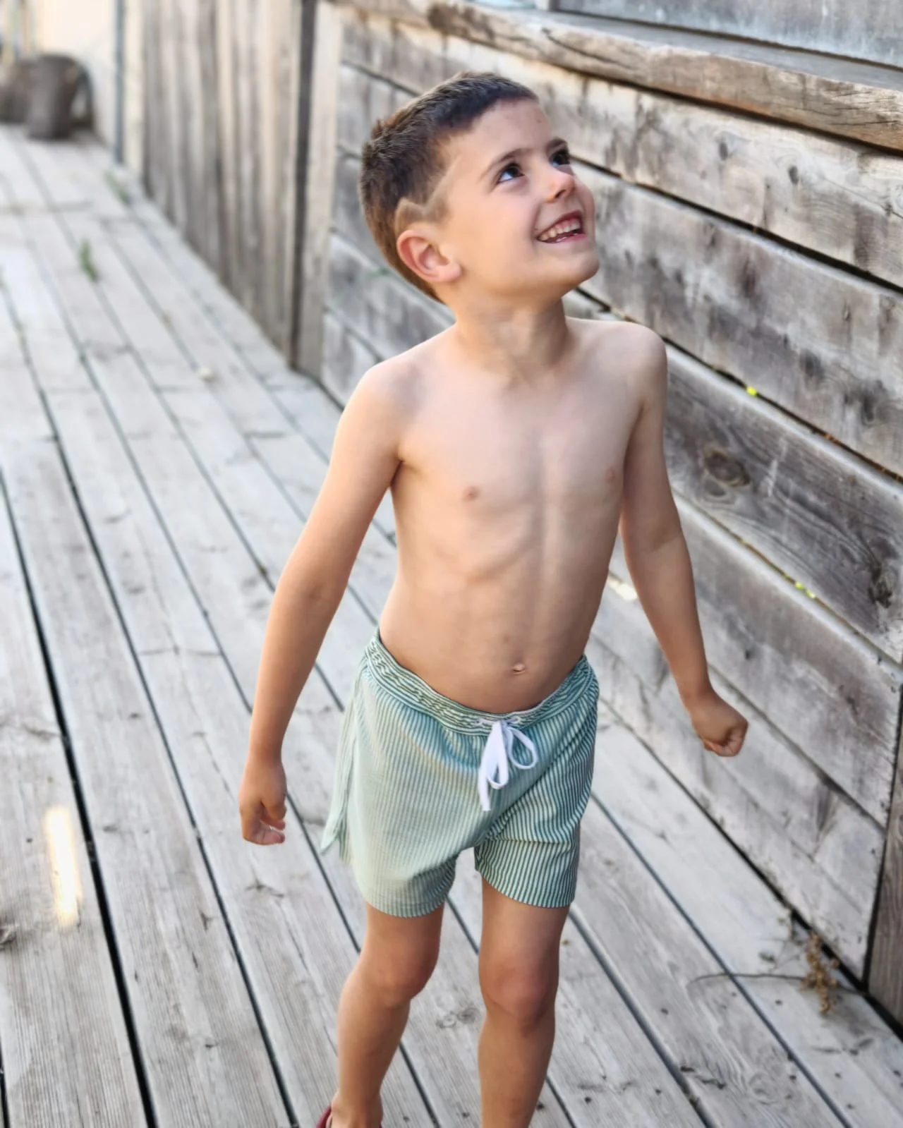 Votre marmot sera libre de ses mouvements grâce au tissu extensible de ce maillot de bain en seersucker Amande. Craquez pour le même modèle pour le papa pour un matchy-matchy sportif et chic.