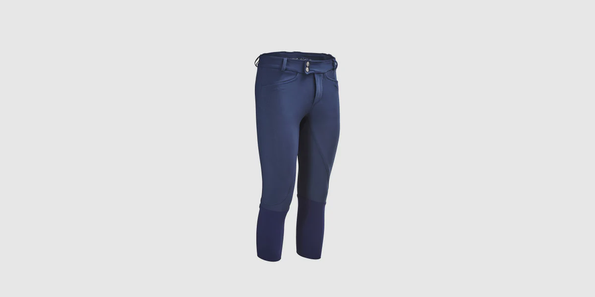 Un pantalon technique pour garçon: jambes préformées et la matière bi-stretch permettent au pantalon de bien s’adapter à la morphologie du jeune cavalier